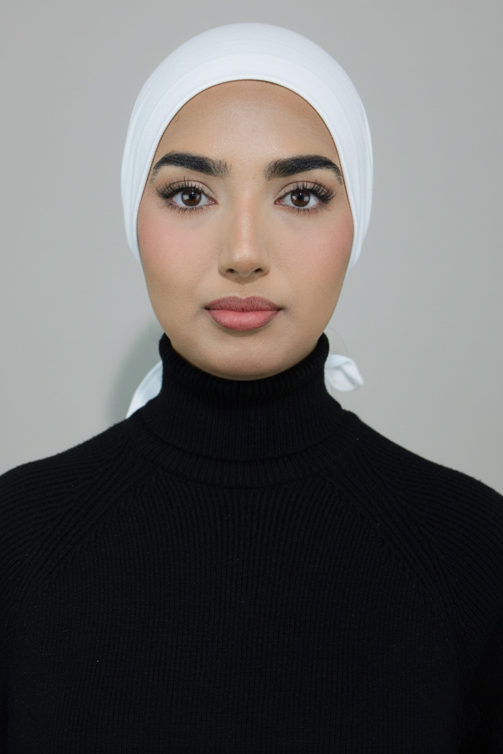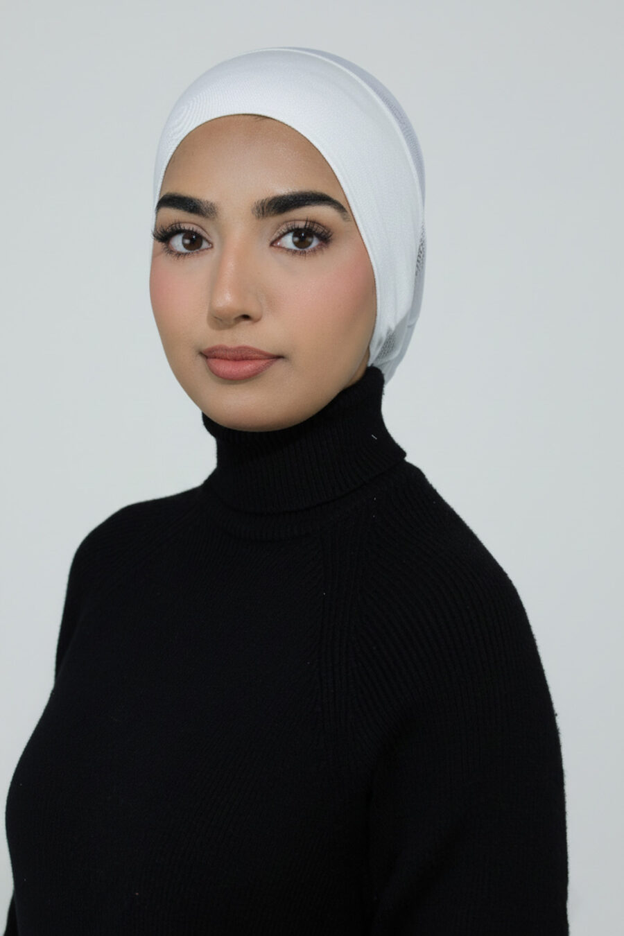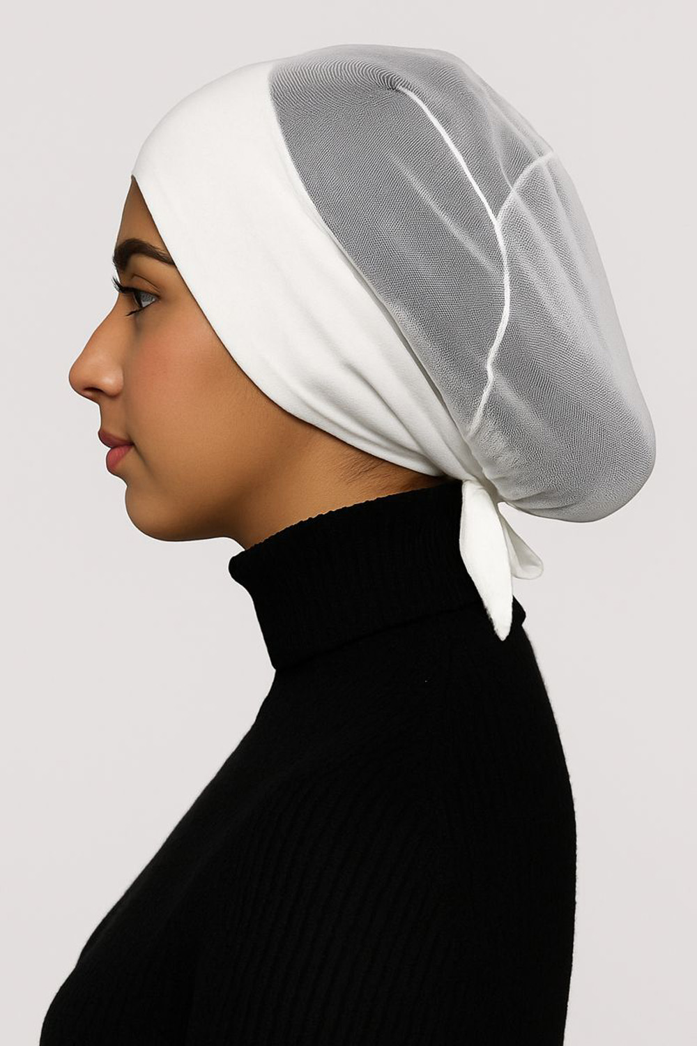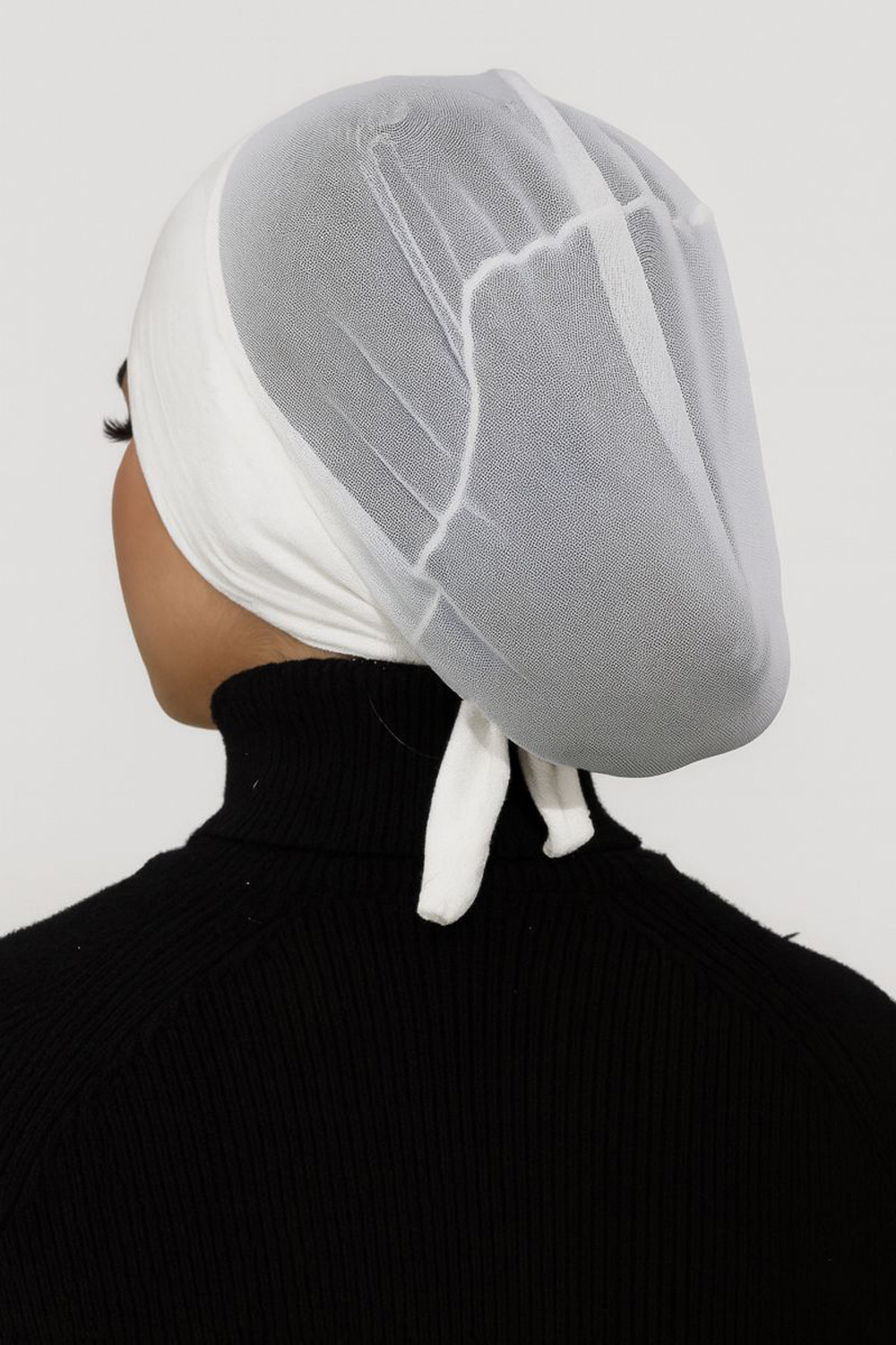 This sleek black undercap is designed to provide full coverage and a secure, comfortable fit beneath any hijab style. Crafted from a lightweight, breathable stretchfabric, it features a smooth opaque front panel paired with a semi-sheer mesh back thatoffers added ventilation without compromising coverage. The tie-back design ensuresadjustability, allowing you to achieve the perfect fit for all-day wear.