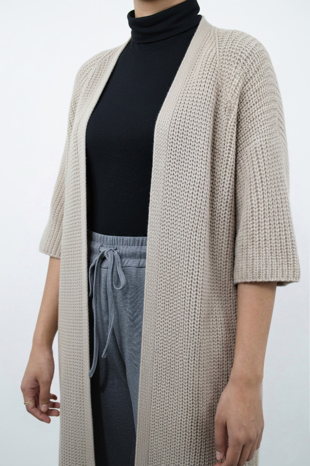 The beige ribbed cardigan extends to full length, which provides a comfortable base for all types of outfits. The open front design of the garment, together with its loose, long sleeves and its softly woven, textured fabric, provides additional warmth which works well with different casual and modest outfits. The outfit serves as an excellent choice for daily use because it enables users to wear their normal clothes as stylish yet comfortable fashion.